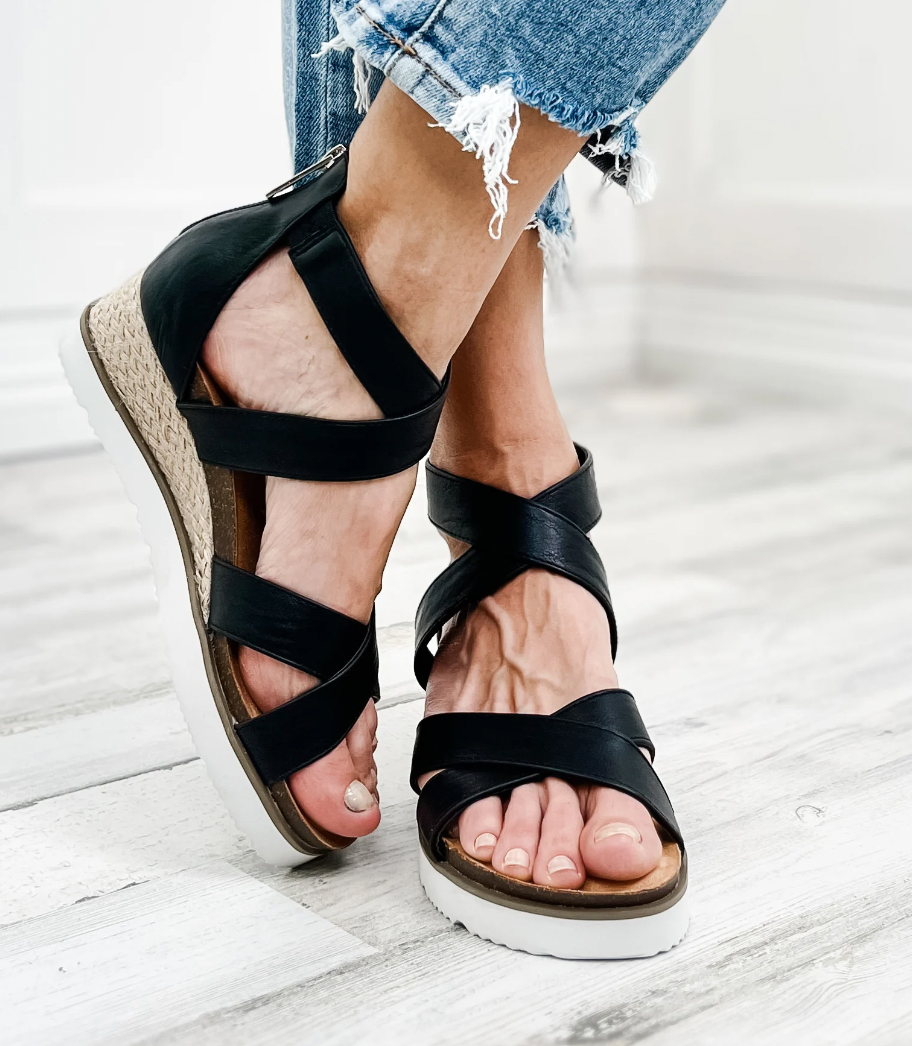 Step up your style game with the Double Dutch Sandals by Corkys! These wedge sandals feature Black faux leather criss-crossed straps and a woven braided wedge for a fun and unique look. With a back zipper and super comfy feel, these sandals are perfect for any adventure.