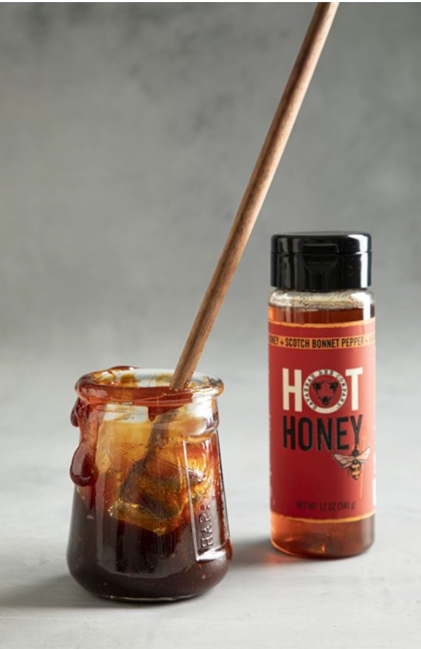 Introducing a honey that brings the heat. Our sweet wildflower honey is infused with heat from scotch bonnet and habanero peppers for the perfect mix of sweet and spicy. Drizzle over chicken or pizza, stir into a margarita, or use it to top off a bowl of vanilla ice-cream. No matter how you decide to use our hot honey, it belongs on your table at all times.
