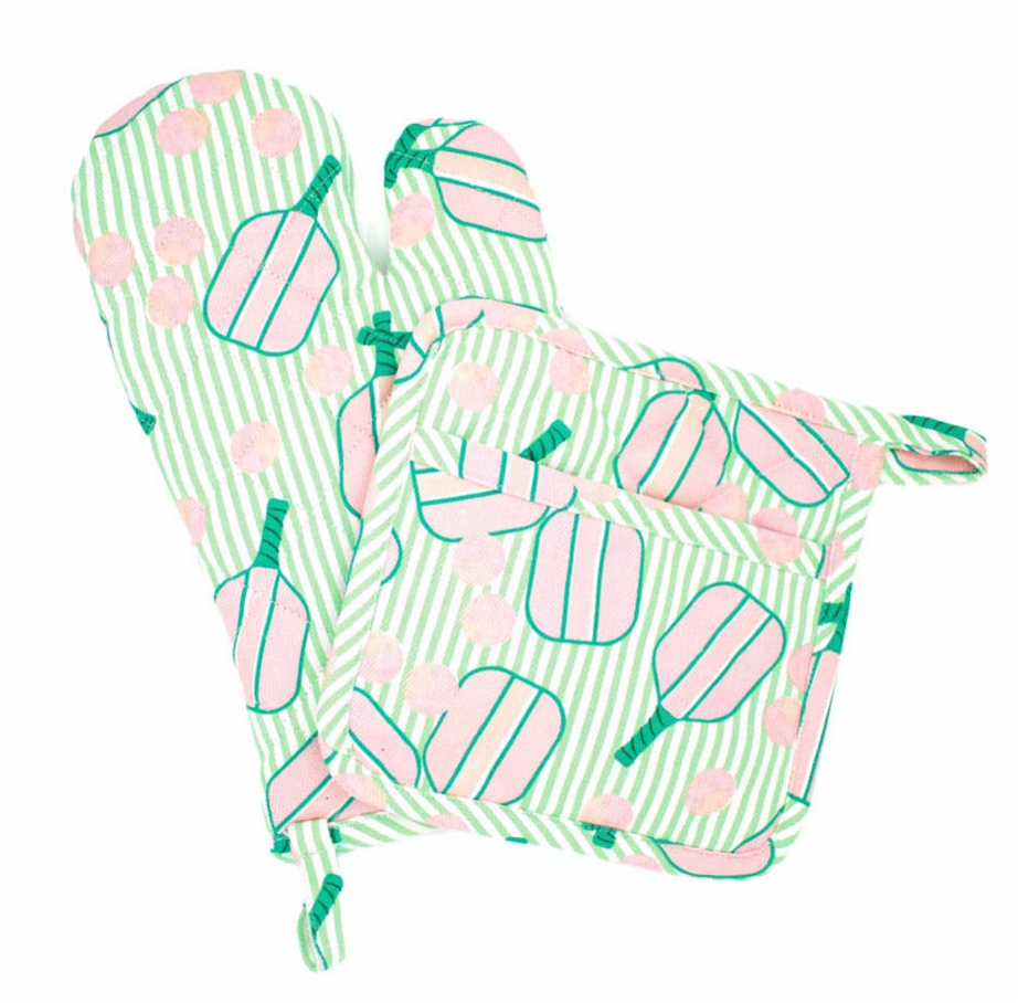 Bring the feeling of being on the pickleball court into your kitchen with our Pickleball Stripe Oven Mitt Set. Get ready to feel sporty & stylish while cooking with this set and its signature pickleball print perfect for adding a sporty flair charm. Crafted from 100% cotton, you know youre getting nothing but the best in quality and comfort. Plus, each mitt and potholder also come complete with a hanging loop for easy storage when not in use! Make sure to pair this beautiful oven mitt set with our Kitchen Towels and Aprons to create a wonderful gift for someone special or just use them as the perfect way to celebrate yourself!