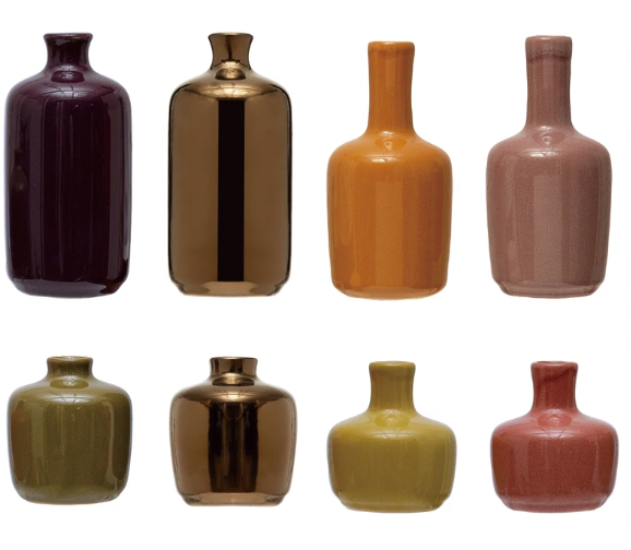 This octet of stoneware vases comes in a variety of shapes and sizes. Their coordinating designs make them perfect accents to spread throughout a room in small groupings. To accent a shelving unit, scatter them in a combination of pairs and trios on different levels of shelves.